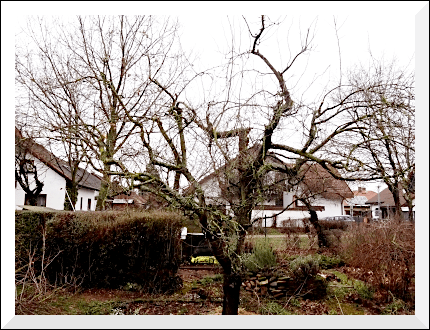 mehrere Gartenparzellen, um den Winterschnitt an verschiedenen Baumsorten anschaulich zu zeigen. Trotz des