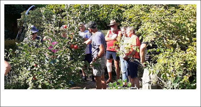 Nach der Begrüßung durch den 1. Vorsitzenden, Bernhard Hillebrandt, ging es wie in den vergangenen Jahren in die einzelnen Gärten der Pächter, um aus erster Hand zu sehen, wie man fachgerecht Obstgehölze und Beerensträucher schneidet.